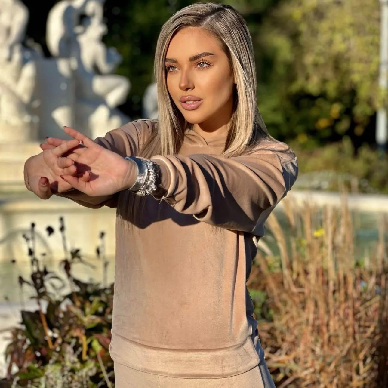 Trening din doua piese, confectionat din catifea. Bluza lejera, fara sistem de inchidere, maneci lungi si pantalon cu talie inalta. Bluza este accesorizata cu gluga.